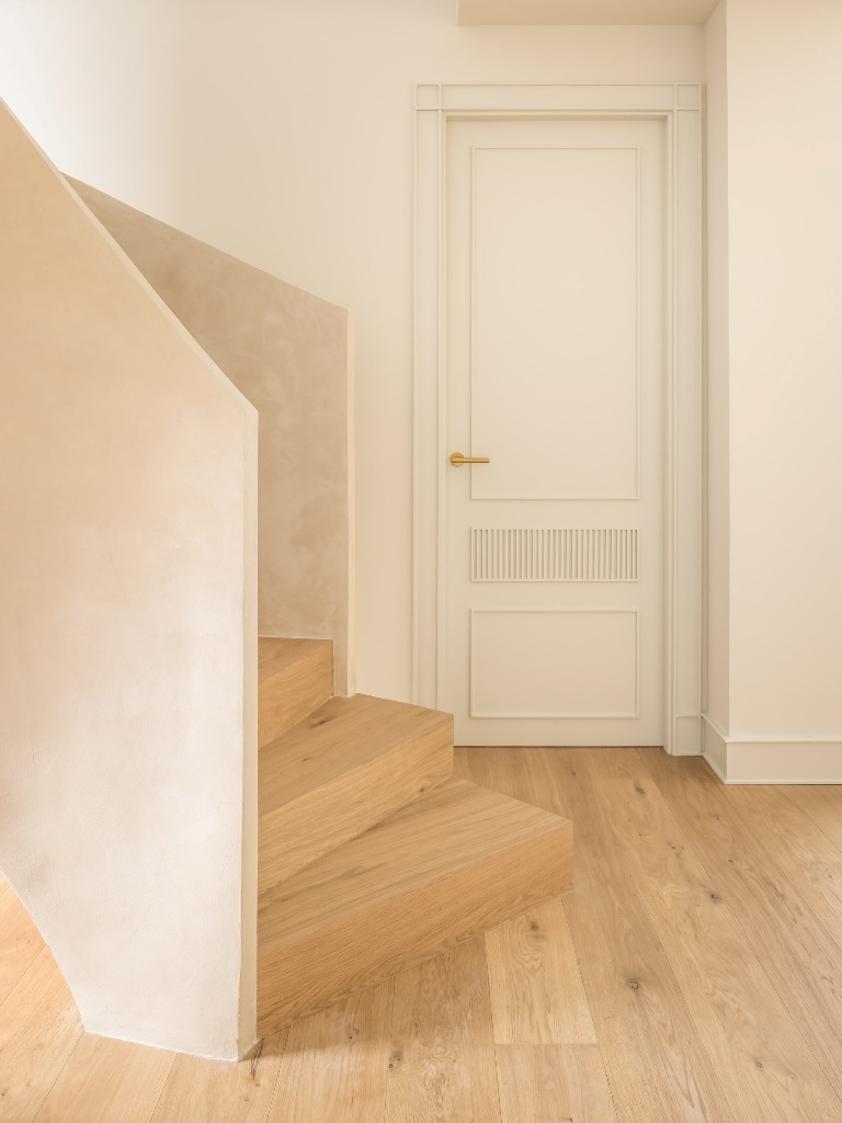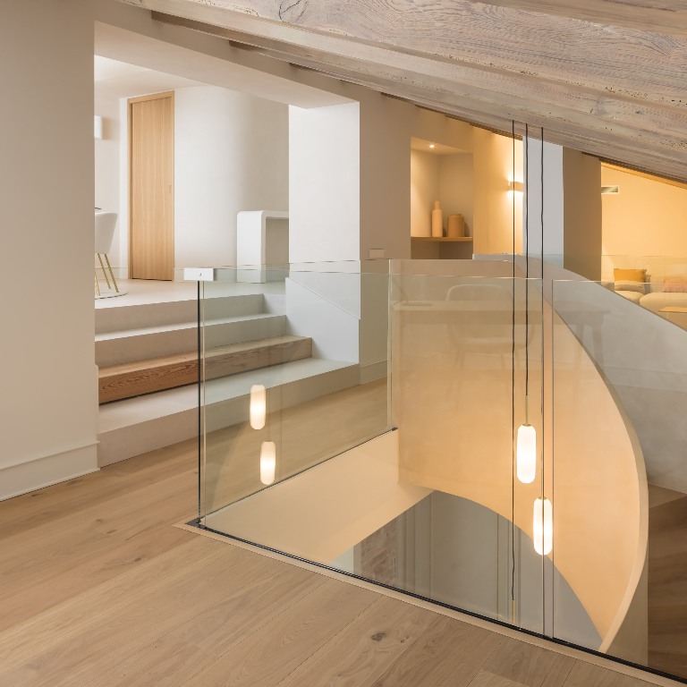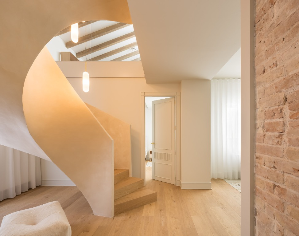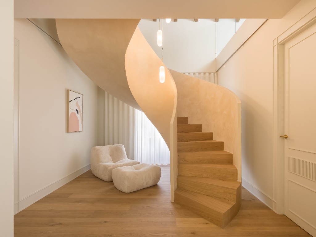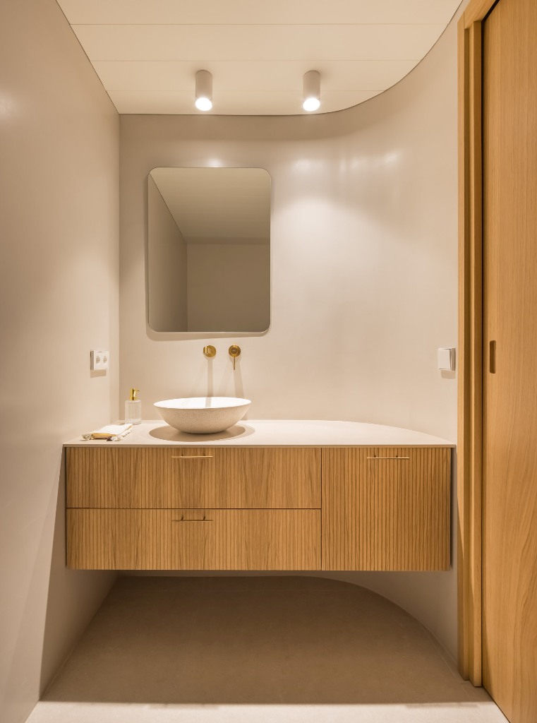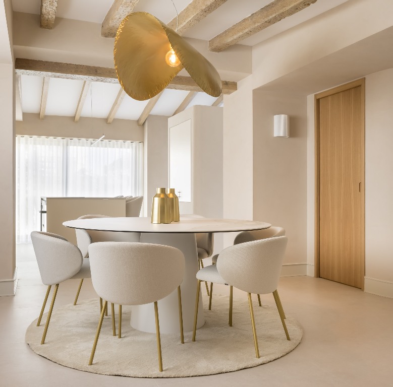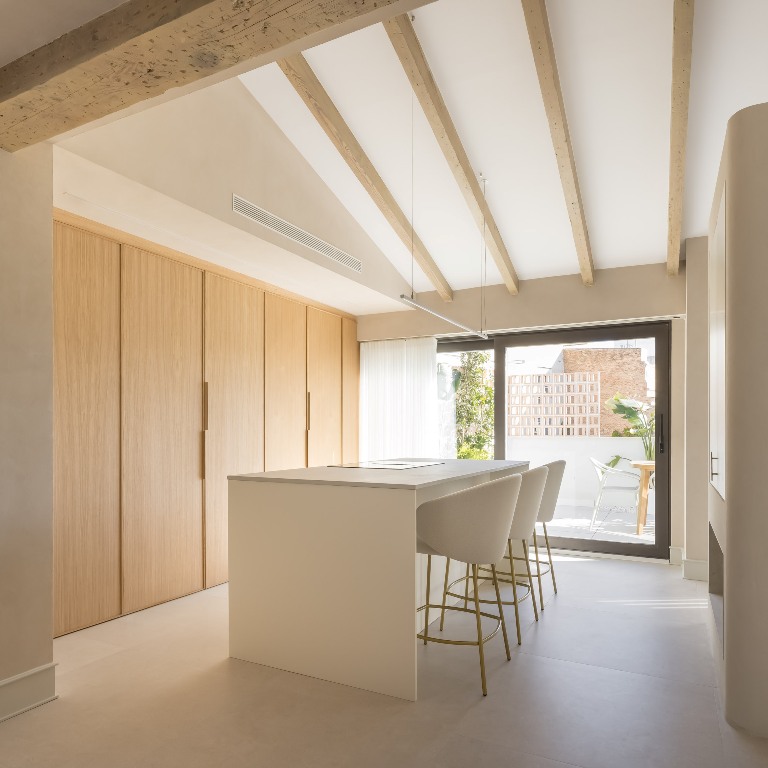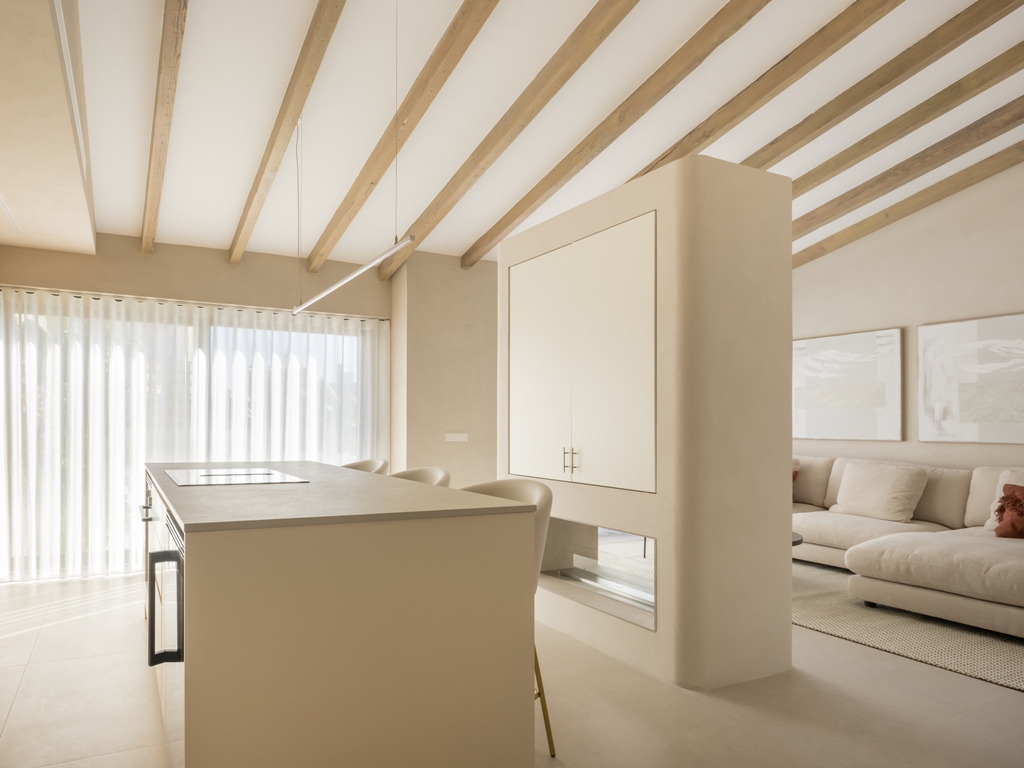 La paleta de materiales seleccionada es el alma del diseño. Predominan los tonos neutros y las texturas orgánicas. Las vigas de madera natural en el techo se conservaron y trataron para aportar un contraste cálido a los paramentos enlucidos en tono arena suave. Este microcemento o enlucido mineral se extiende también por el suelo, creando una continuidad visual que unifica todo el espacio.